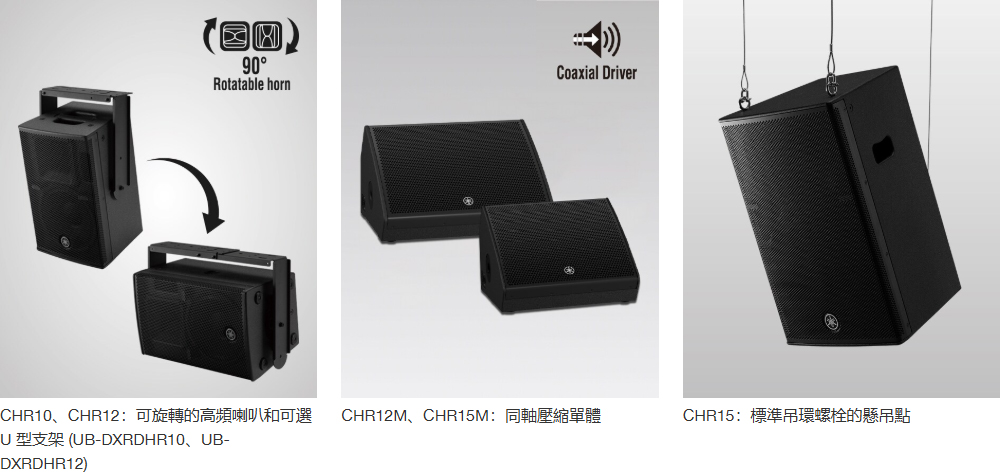 CHR10 和 CHR12 配備可旋轉式號角和專用 U 型支架,可用於固定安裝、公用空間,而 CHR12M 和 CHR15M 配備同軸壓縮單體,可提高地板監聽的清晰度和更平滑的頻率響應。CHR15 的推出使得該系列更為完整,內建懸吊點可用於固定安裝。CHR12 和 CHR15 還配置雙角度喇叭架支撐孔,可作為臨時主喇叭以進行擴音。